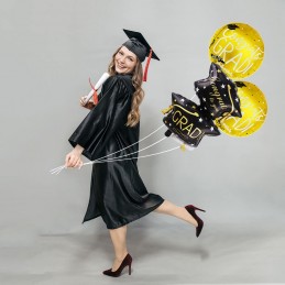 Balonul include două toci negre și mesajul inspirator "Congrats, GRAD!", care exprimă felicitări și mândrie.