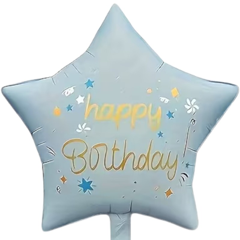 Balonul din folie în formă de stea bleu, cu finisaj mat și mesaj Happy Birthday, este alegerea perfectă pentru decoruri elegante și festive la aniversări.