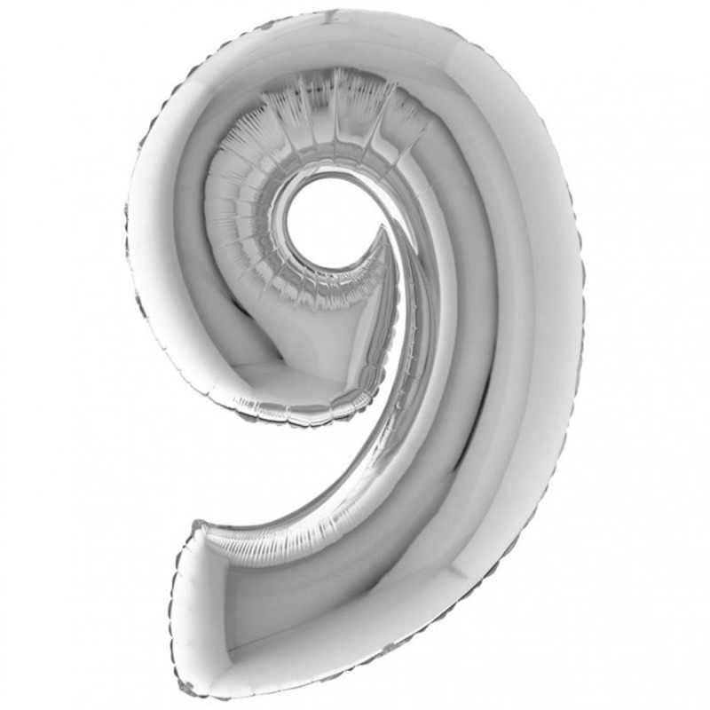 Balon din folie argintie "Cifra 9" cu dimensiunea de 100 cm . Balonul poate fi umflat cu heliu sau cu aer .