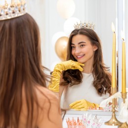 Coroana cu pietre prețioase este alegerea perfectă pentru trendul viral în care coroana este așezată pe tort, alături de o lumânare: sărbătorita își pune o dorință, suflă în lumânare, apoi își așează coroana pe cap, transformând momentul într-o amintire de neuitat. După petrecere, coroana poate fi păstrată ca suvenir prețios sau reutilizată în ședințe foto, aranjamente florale ori decoruri festive.