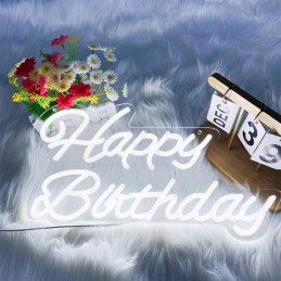 Semn luminos neon HAPPY BIRTHDAY cu dimensiunea de 42x23cm, cu lumina alba rece cu adaptor, switch ON/OFF si reglarea intensitatii luminii pe 3 trepte, conectare usb + lant pentru agatare, pe suport din plexiglas transparent.