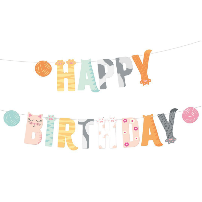 Banner Happy Birthday cu pisicuțe, 200 cm lungime, litere înalte 18 cm, din carton rezistent. Perfect pentru petreceri tematice cu pisici.