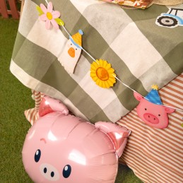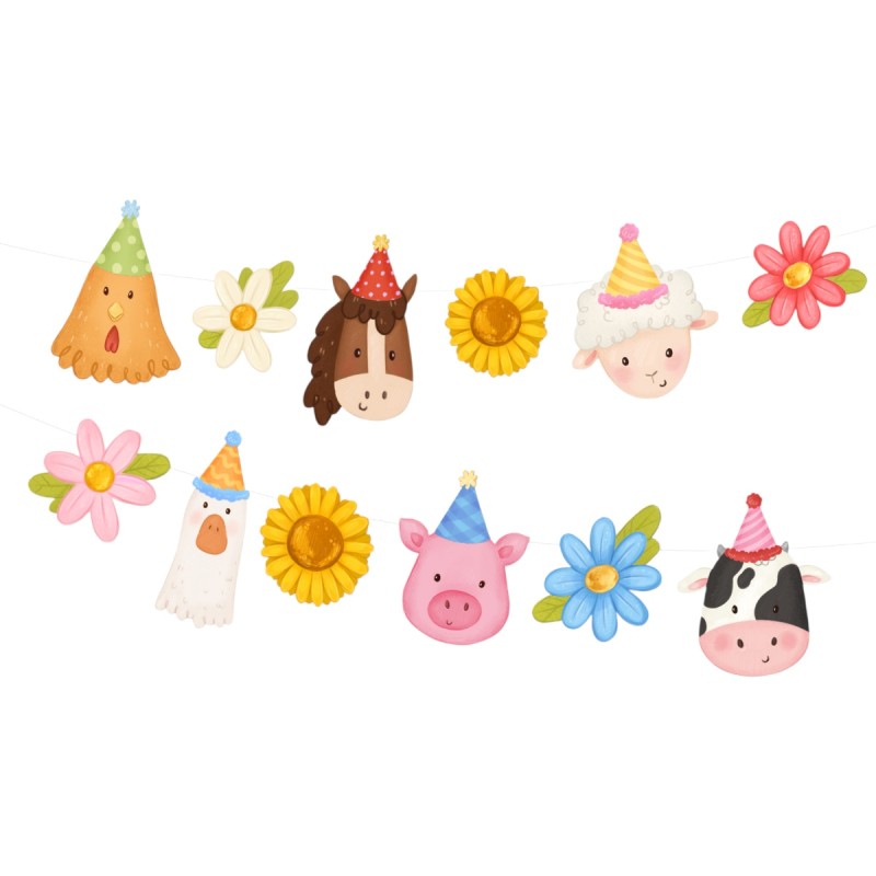 Ghirlanda pentru petrecere cu tematică fermă este alegerea perfectă pentru a crea un decor vesel și plin de culoare la evenimentele dedicate copiilor. Decorată cu animale simpatice precum găină, rață, oaie, porc, vacă și cal, alături de flori decorative, această ghirlandă aduce atmosfera autentică a unei ferme direct în spațiul petrecerii.