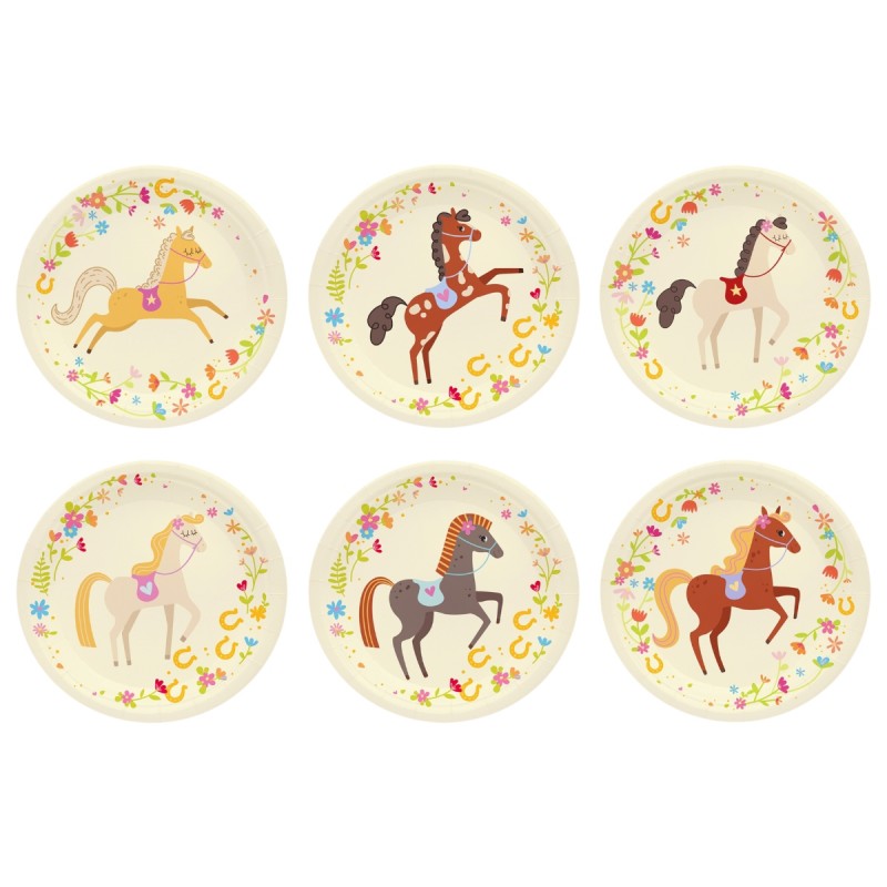 Set 6 farfurii din carton cu tematică căluți, 18 cm. Ideale pentru petreceri copii, aniversări și evenimente echitație.