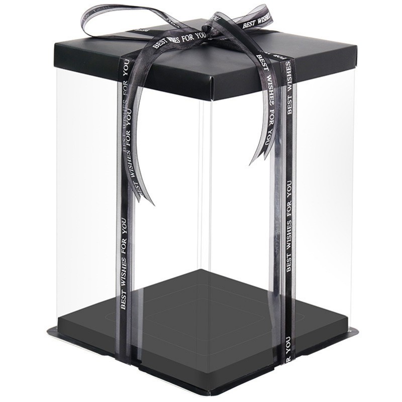 Cutie transparenta din acetofan in inaltimea de 30 cm si capace negre utilizate pentru ursuleti din trandafiri din spuma, tort cu inaltimea maxima de 25 cm, cadouri sau aranjamente florale. Inaltime cutie: 30 cm Dimensiune capac: 18*18*1 cm ATENTIE! Dezlipiti folia de protectie de pe cutia transparenta dupa asamblare. *Nu include panglica decorativa.