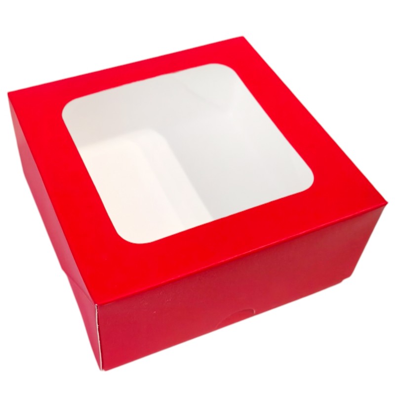 Cutia are dimensiunile de 13*13 cm și o înălțime de 5.5-6 cm, fiind realizată din carton rosu pliabil de calitate cu vizor din pvc transparent.