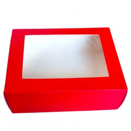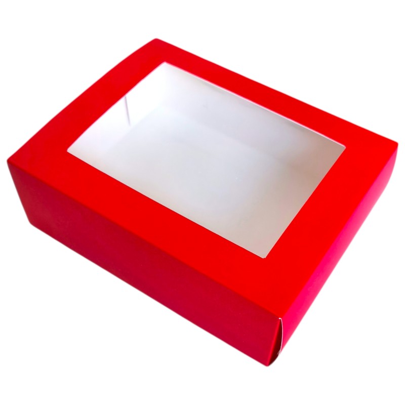 Cutia are dimensiunile de 19*12 cm și o înălțime de 5 cm, fiind realizată din carton rosu pliabil de calitate cu vizor din pvc transparent.