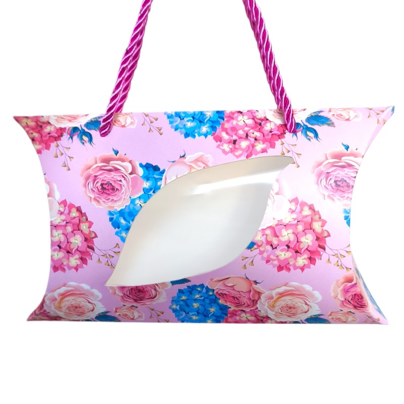 Cutia plic cu mânere și vizor este realizată din carton imprimat în nuanțe delicate de roz, decorat cu trandafiri, oferind un aspect elegant și feminin, perfect pentru ambalarea cadourilor speciale. Designul tip plic, cu închideri laterale parte peste parte, permite o asamblare rapidă și ușoară, fără a fi nevoie de adeziv.