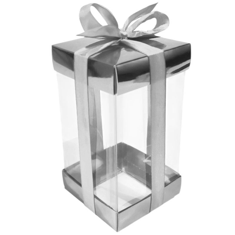 Cutie pliabila, transparenta, din acetofan in inaltimea de 13cm si baza de 7*7cm si capace metalizate argintii + panglica asortata inclusa, utilizate pentru cadouri, martisoare, dulciuri sau aranjamente florale.