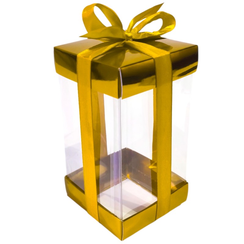 Cutie pliabila, transparenta, din acetofan in inaltimea de 13cm si baza de 7*7cm si capace metalizate aurii + panglica asortata inclusa, utilizate pentru cadouri, martisoare, dulciuri sau aranjamente florale.