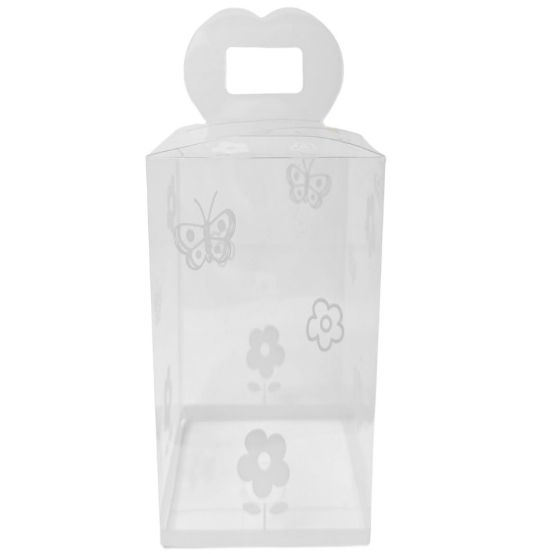 Cutie transparentă din acetofan cu floricele si fluturasi albi, 12x10x8 cm, cu mâner, pentru aranjamente florale, mărțișoare. Montaj rapid. Livrare Imediata!