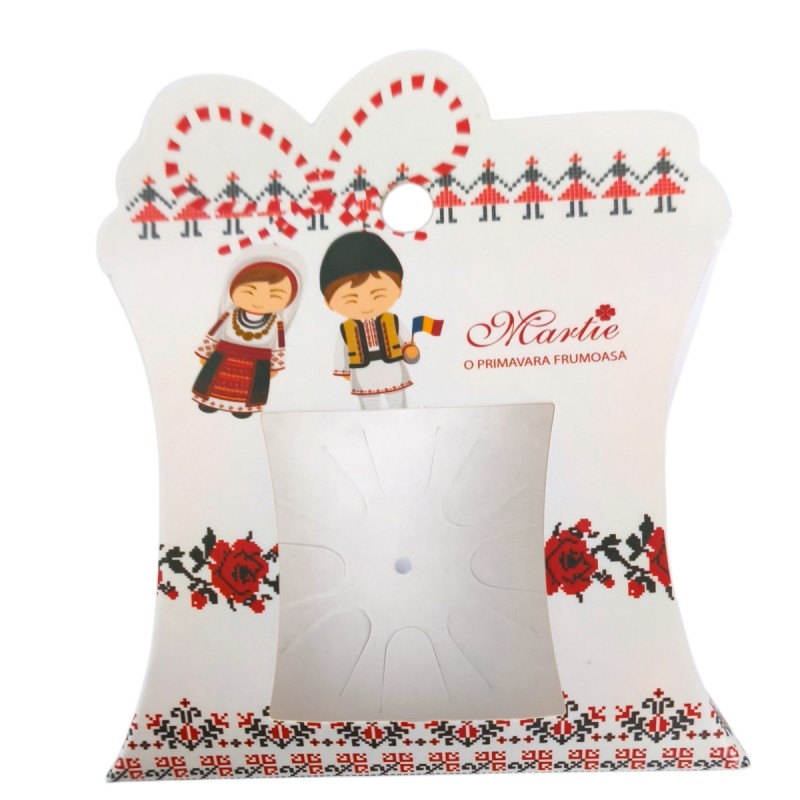 Setul include 100 de cartonase display, fiecare cu dimensiuni de 10 cm înălțime și 6 cm lungime, realizate din carton de calitate. Designul cu copii in port popular și mesajul "Martie" adaugă un plus de farmec și distincție fiecărui ambalaj, fiind ideal pentru sezonul mărțișorului.
